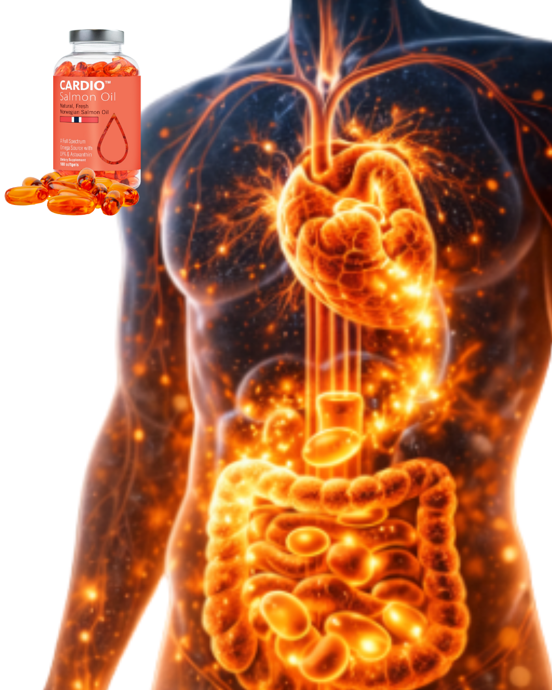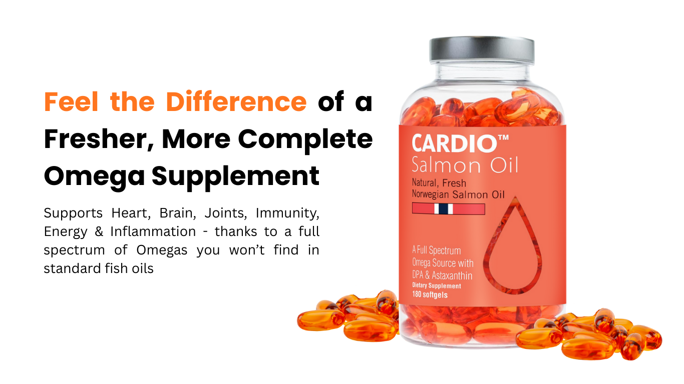 CARDIO™ uses a single-ingredient salmon oil produced to human-grade standards, not blended fish oils from multiple sources. It delivers a full spectrum of naturally occurring omegas including EPA, DHA, and DPA, along with naturally present antioxidants and vitamins, resulting in a cleaner, more complete omega supplement than standard fish oil products.